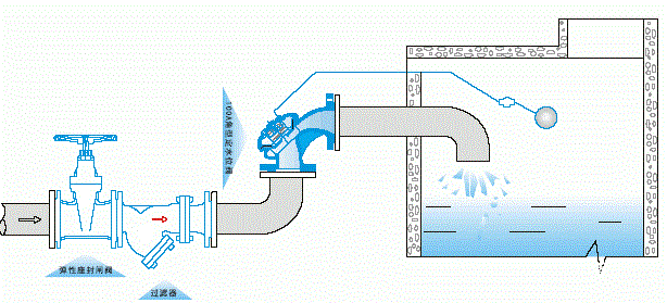 100A角型定水位阀是一种隔膜式调节水箱和水塔液面高度的阀门。阀门由一特殊强化尼龙膜片将其分为上下两个腔室,当液面达到设定位置时,浮球导阀关闭,上腔压力大于下腔,阀门关闭,即停止供水.当液面下降超过预设位置,浮球导阀开启,上腔压力小于下腔压力,阀门开启.阀门向池内供水。角型定水位阀安装方便,可省去管道弯头,节省安装空间。该阀保养简单、灵活耐用、液位控制准确度高,水位不受水压干扰且关闭紧密不漏水,性能可靠、成本低。浮球可随水池的高度和距离安装。
